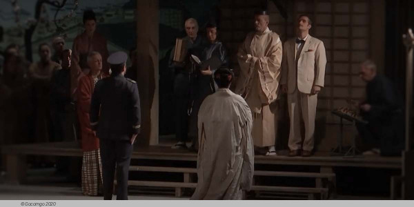 1. A short orchestral prelude with a busy, fugal opening theme, followed by a second theme of more overtly Japanese character, leads straight into the opening scene.